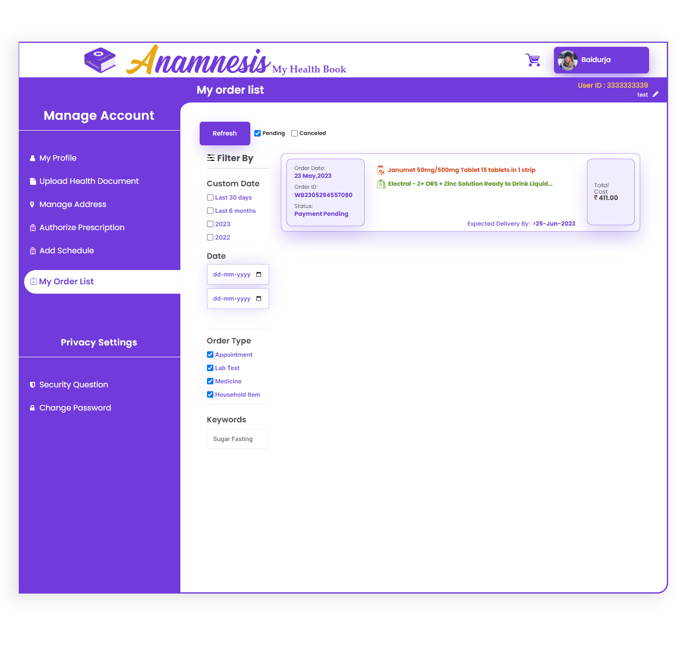 You can book required medicines from Anamnesis. in by visiting your cart/ From your prescriptions,/ By phone call.